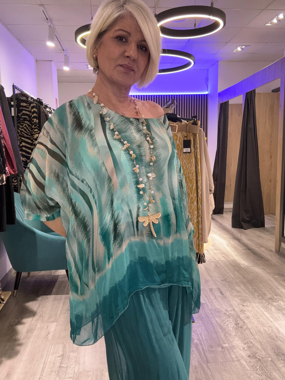 Conjunto Seda Salma – Elegancia fluida en tonos acuáticos Conjunto de dos piezas confeccionado en...