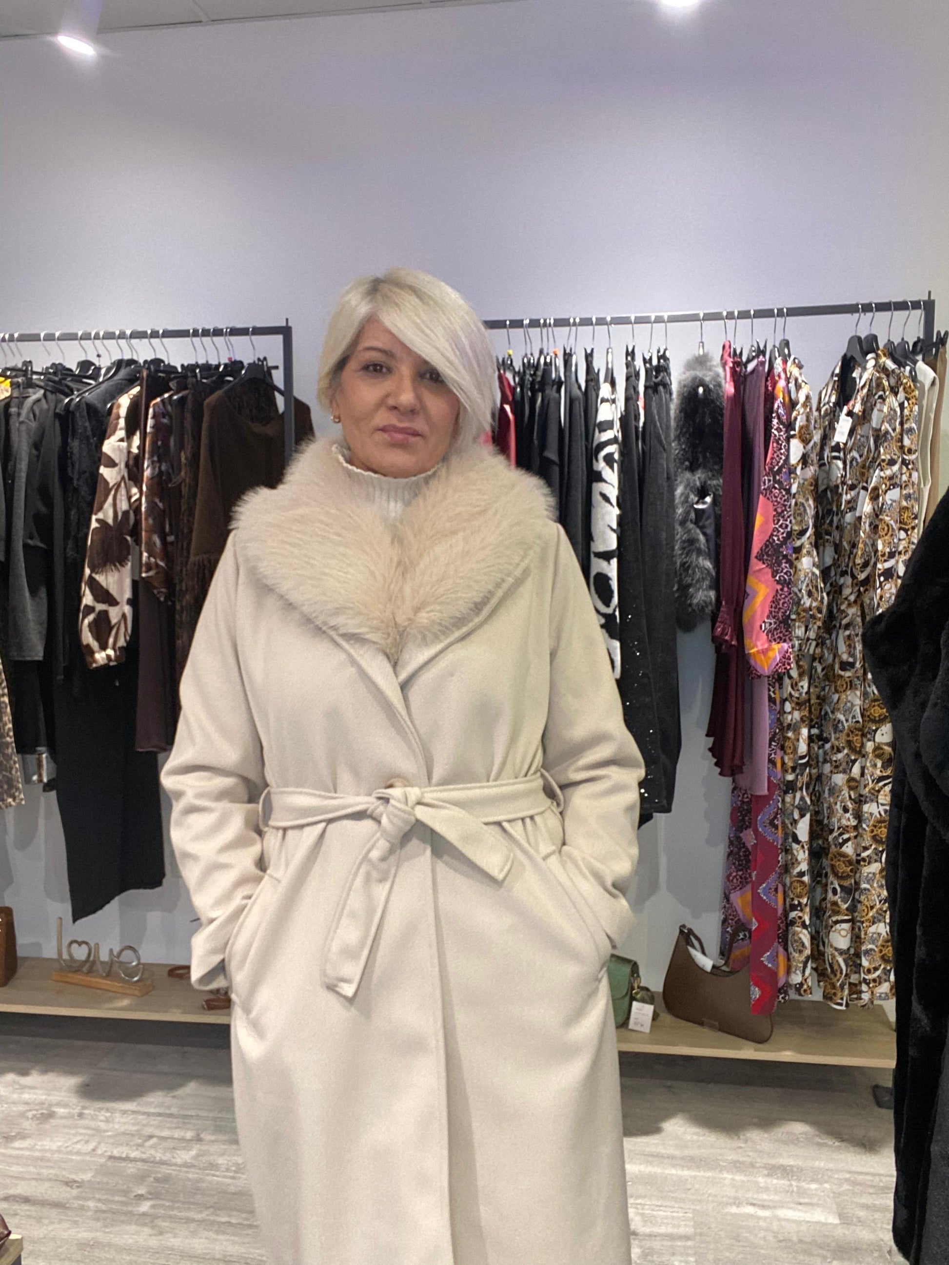 Este abrigo es la inversión inteligente para tu armario invernal. Su diseño largo y elegante con el detalle de pelo en la solapa lo convierte en una pieza versátil que funciona tanto para ocasiones formales como casuales. Es ese abrigo especial que te hace sentir sofisticada cada vez que lo llevas.