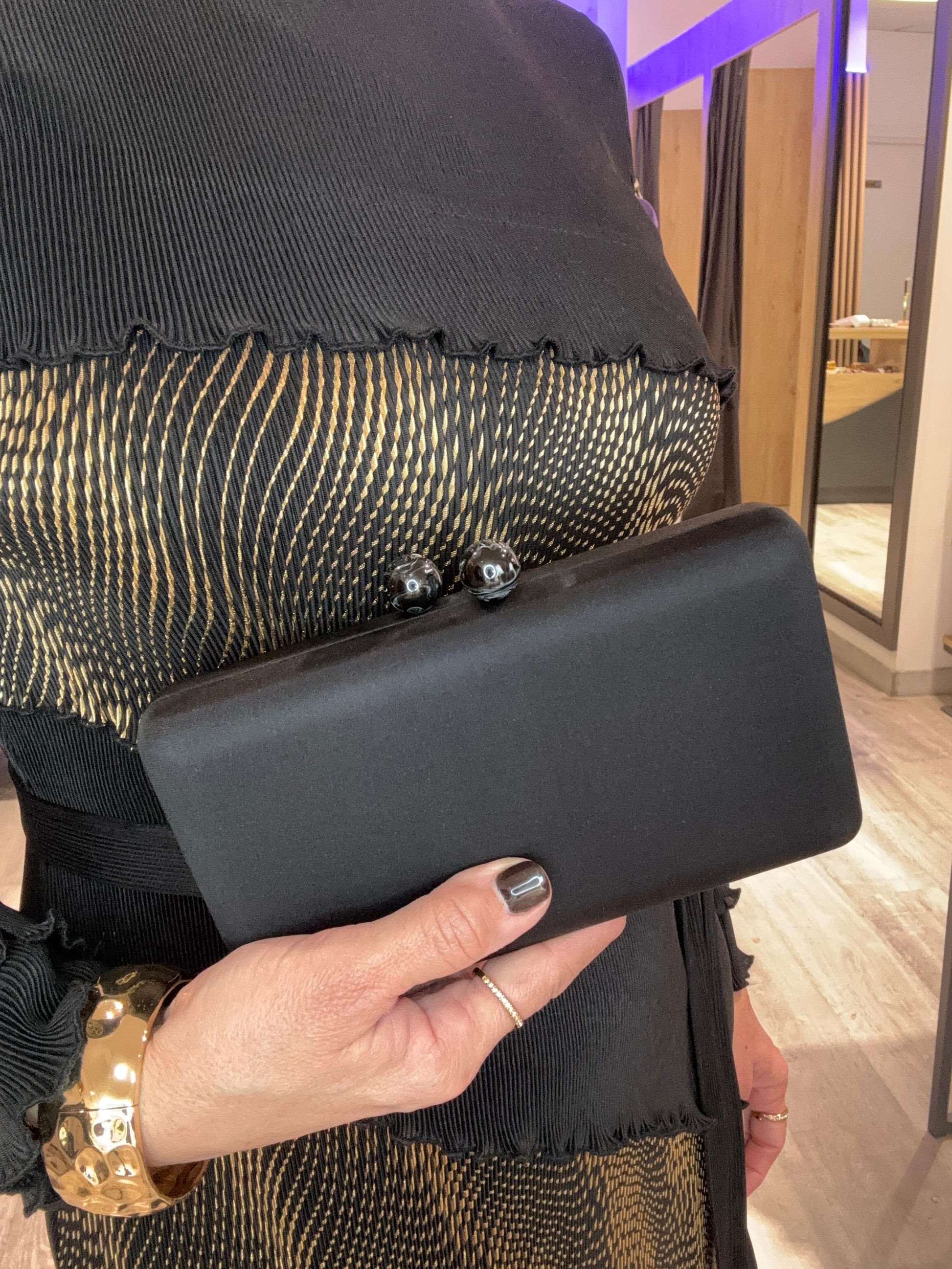 Descubre este elegante bolso de mano en acabado satinado negro, perfecto para tus ocasiones especiales. Su diseño tipo monedero con cadena combina sofisticación y funcionalidad en un tamaño compacto ideal.