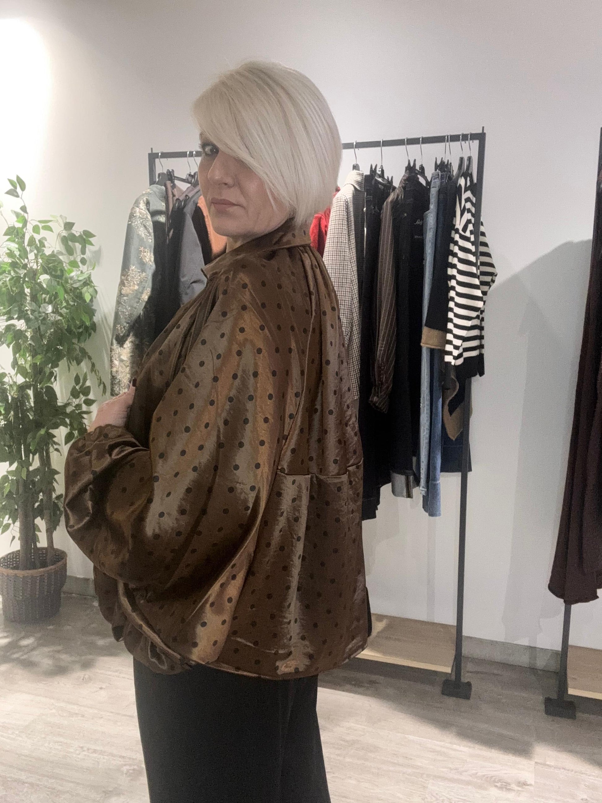 Confeccionada en tejido satinado color bronce con estampado de lunares, esta bomber combina la actitud urbana con el lujo discreto que define tu estilo. Su caída fluida, corte generoso y mangas amplias crean una silueta envolvente y favorecedora.