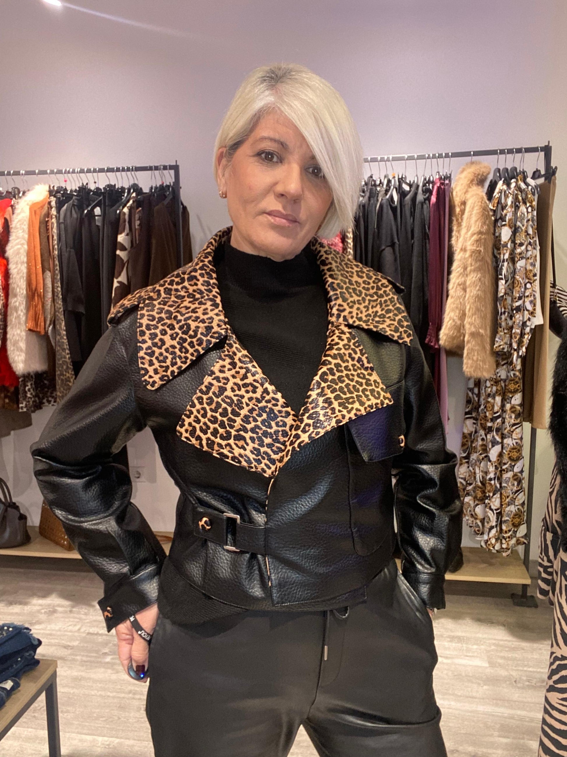 Esta chaqueta biker en polipiel de alta calidad combina la actitud urbana con un toque salvaje gracias a sus detalles en animal print. Un diseño atemporal que aporta carácter y sofisticación a cualquier look, perfecta para la mujer que no teme destacar.