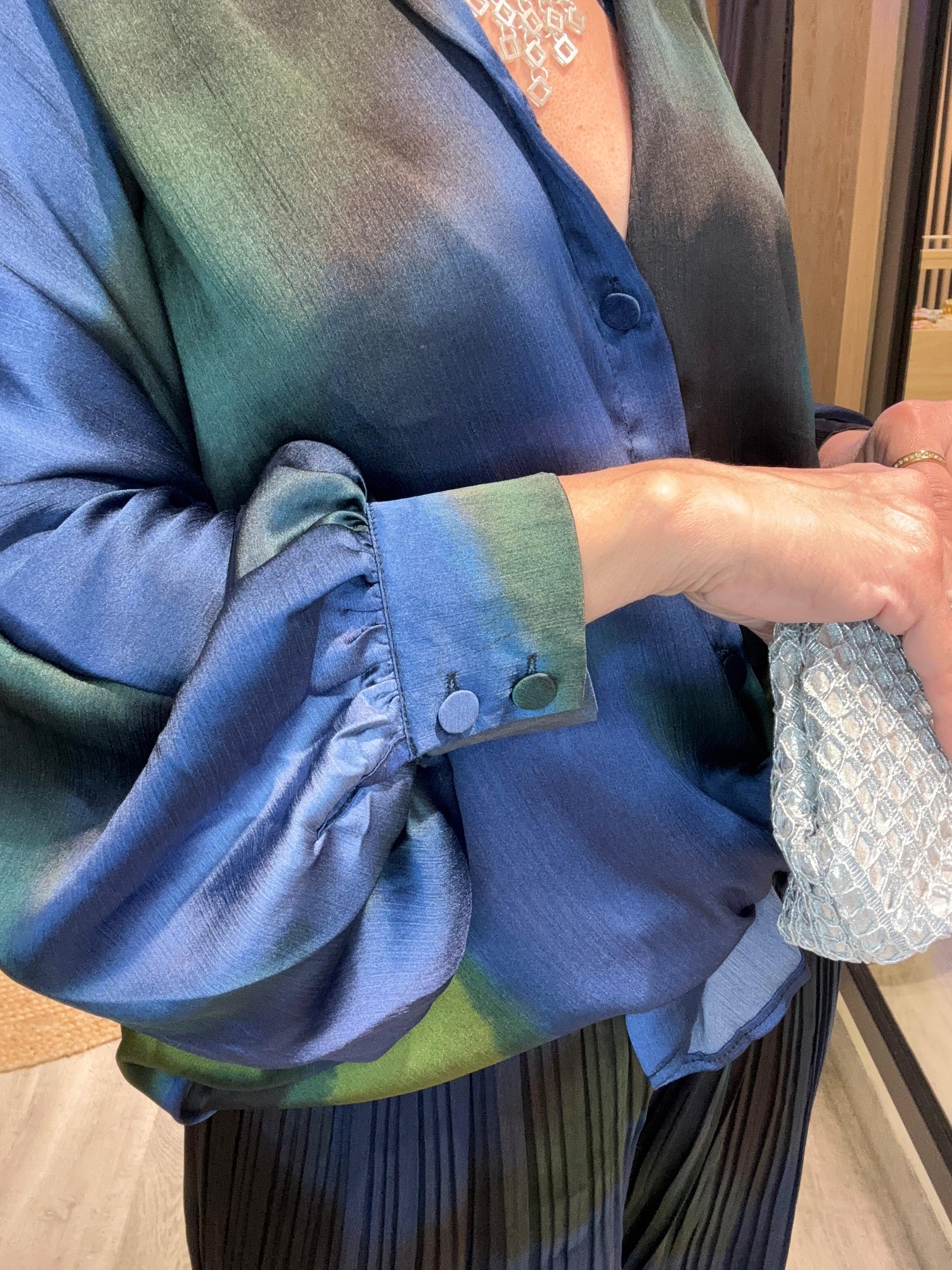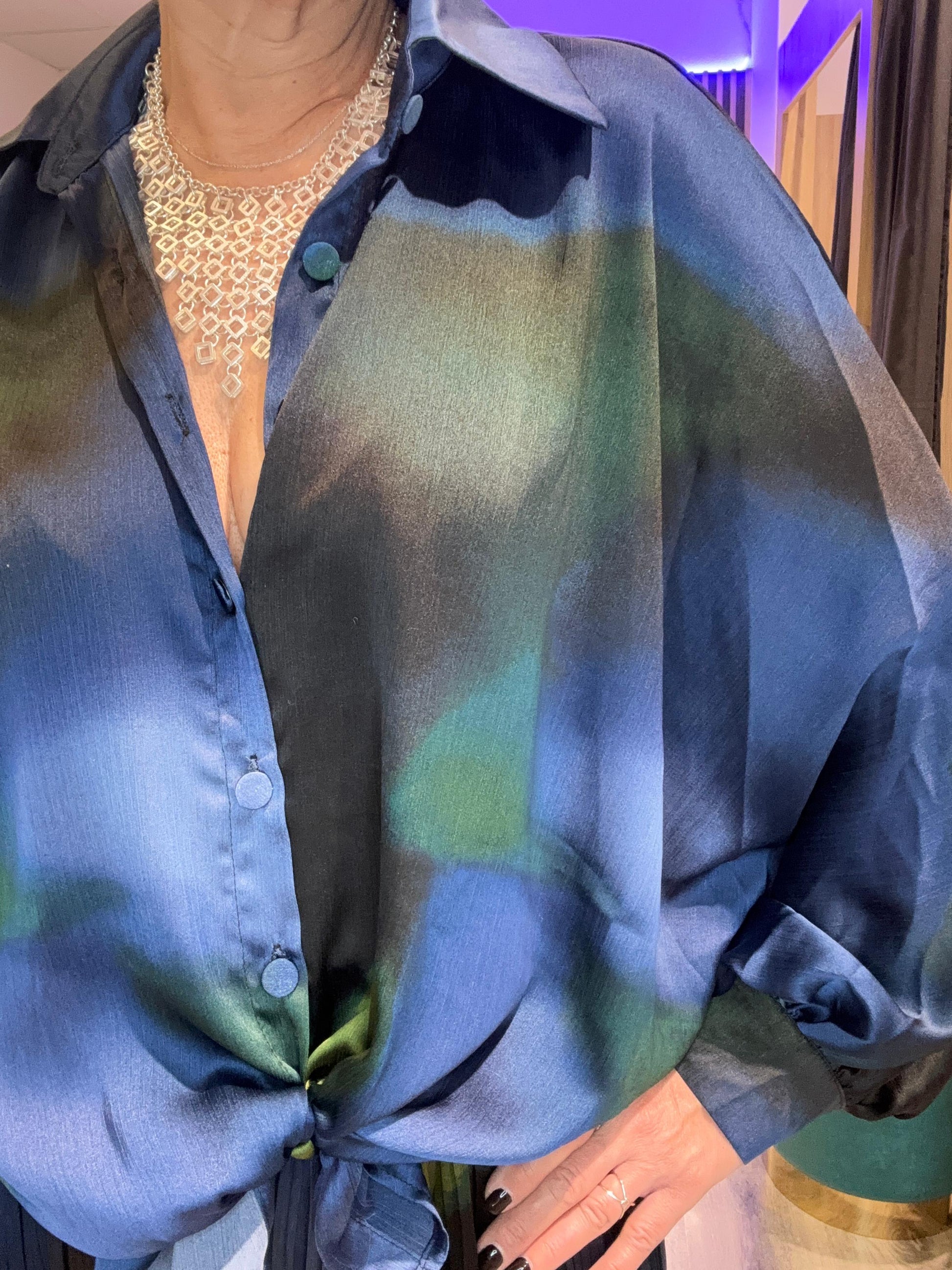 Conjunto de dos piezas de línea fluida y favorecedora, camisa abierta con botones forrados corte mariposa , pantalones pliegues que no aportan volumen .Diseño versátil perfecto para crear looks elegantes y cómodos.