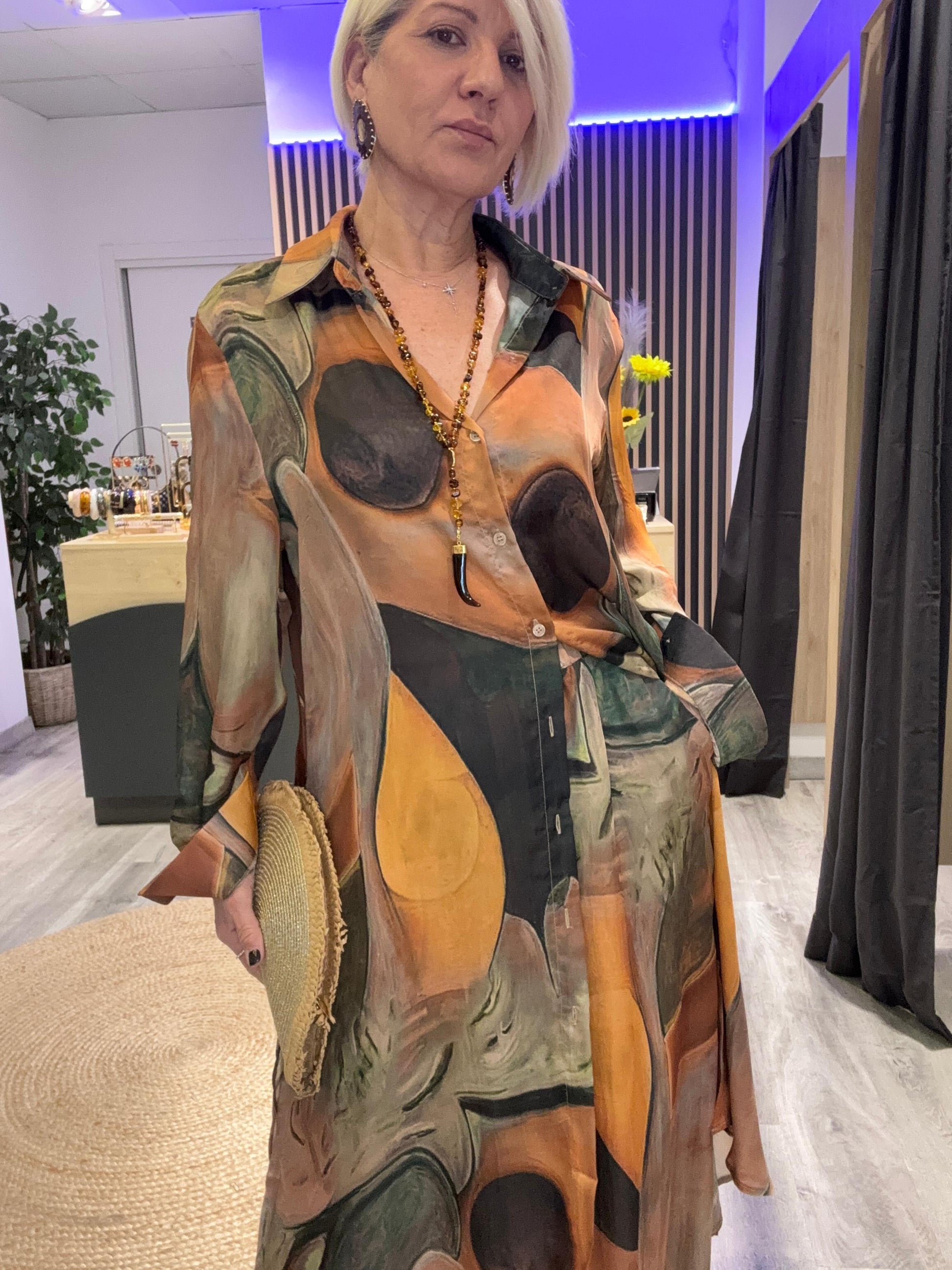 Conjunto D” ambossa con estampado elegante y sofisticado. Tejido de alta calidad que ofrece comodidad y fluidez, perfecto para lucir impecable en ocasiones especiales con un toque boho-luxe.
