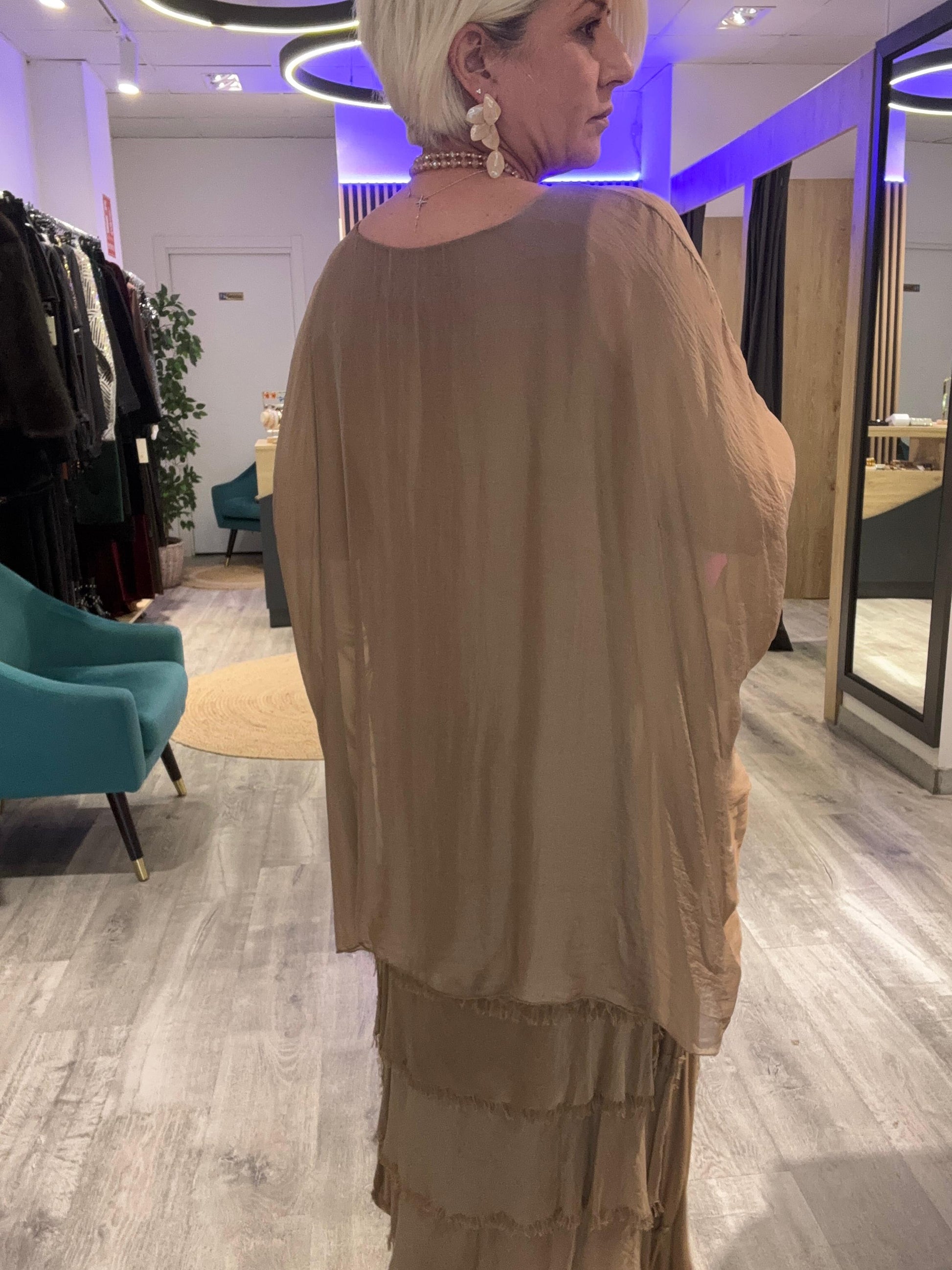 Un conjunto sofisticado y romántico que combina elegancia bohemia con detalles delicados. La blusa tipo capa en gasa con mangas top interior con volantes en delantera hasta la cadera la sobre capa crea un efecto etéreo y favorecedor, mientras que la falda larga con volantes aporta movimiento y feminidad. Perfecto para ocasiones especiales o looks boho-chic con personalidad