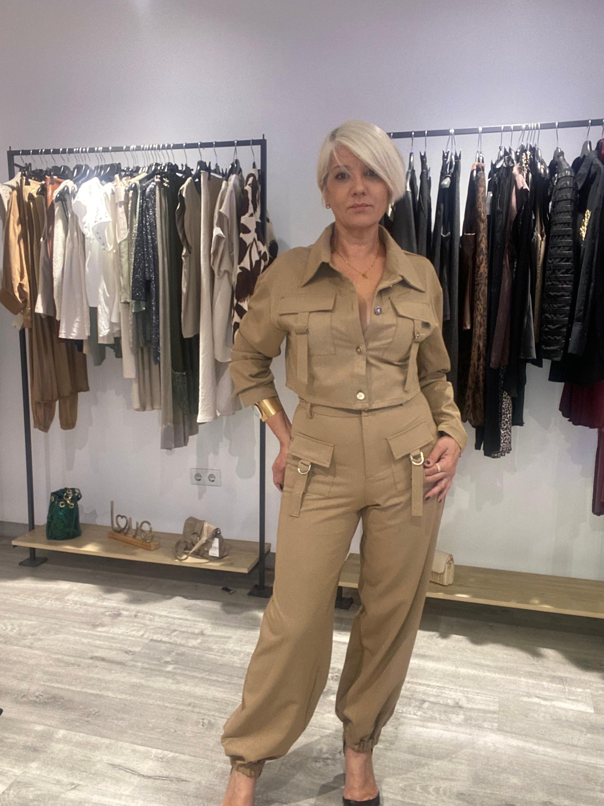 chaqueta con botones y bolsillos cargo en delantera , largo por la cintura, pantalón bombacho tiro alto con bolsillos cargo en delantera