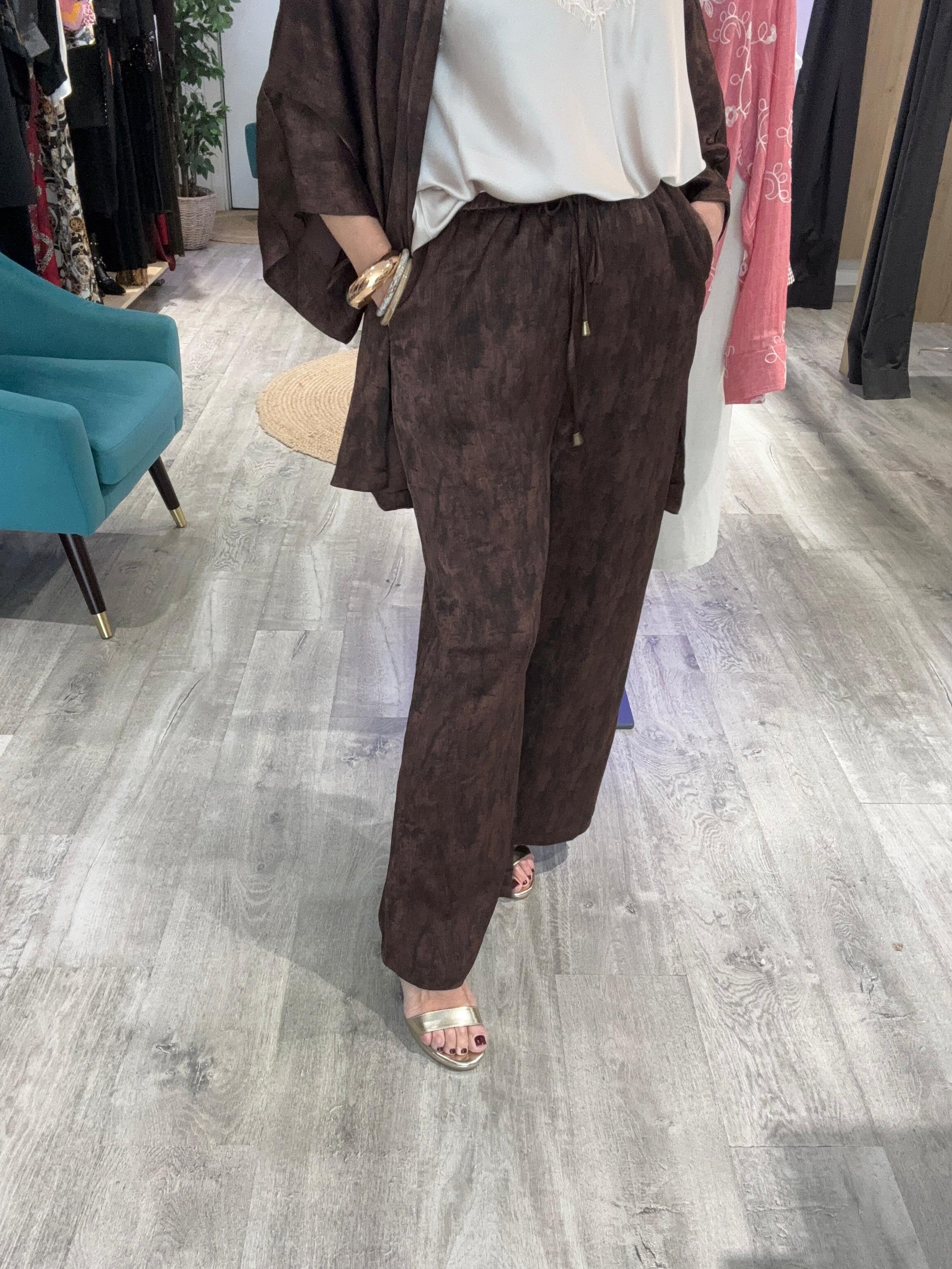 Déjate envolver por la magia del desierto con nuestro Conjunto Marrakech en tonos marrones con estampado exclusivo. Confeccionado en caftán de alta calidad con forro interior y pantalón con cintura ajustable y bolsillos.