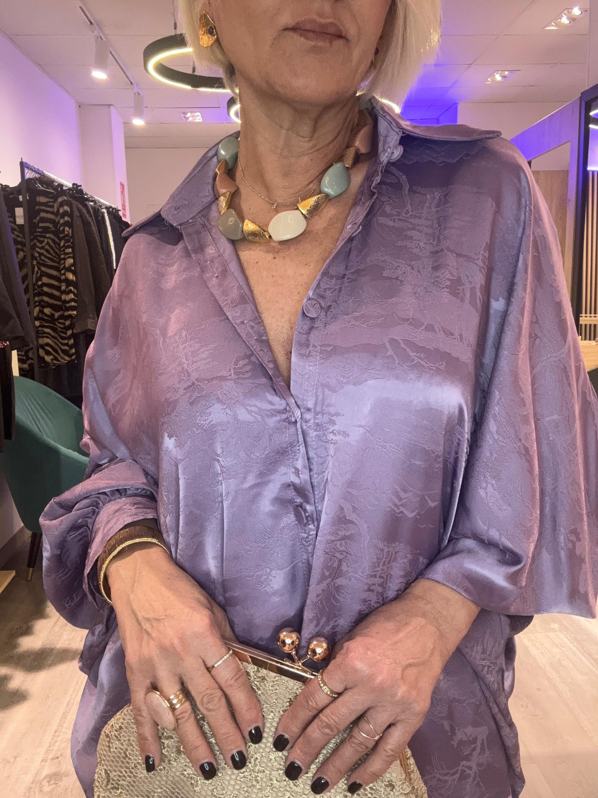 Conjunto de dos piezas de línea fluida y favorecedora en tono Lila blusa con botones y pantalón con pliegues que no aportan volumen. Diseño versátil perfecto para crear looks elegantes y cómodos.