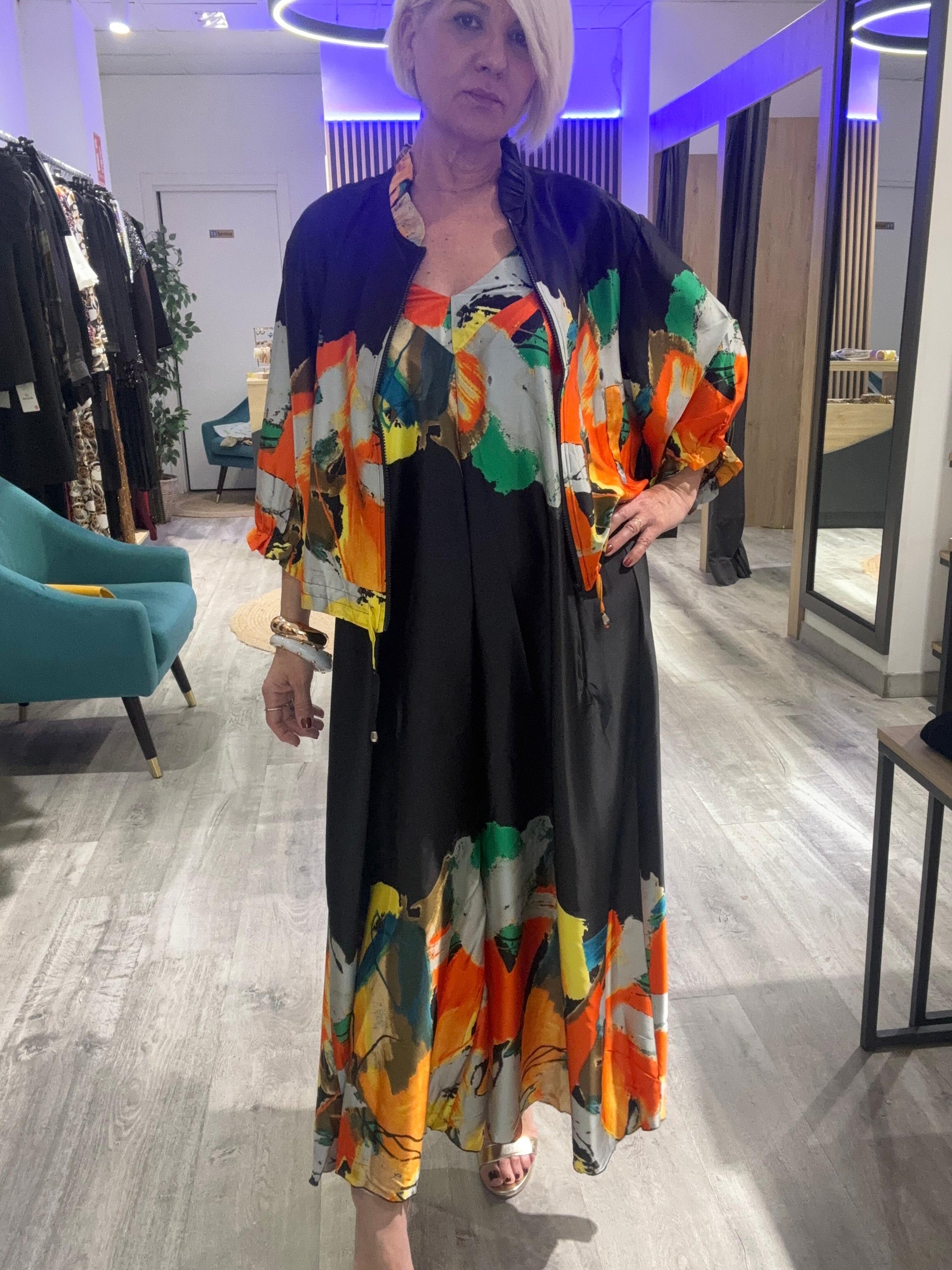 Conjunto de dos piezas que combina estilo y comodidad. Incluye bomber con detalles y mono de corte favorecedor, perfecto para looks casuales con un toque sofisticado.