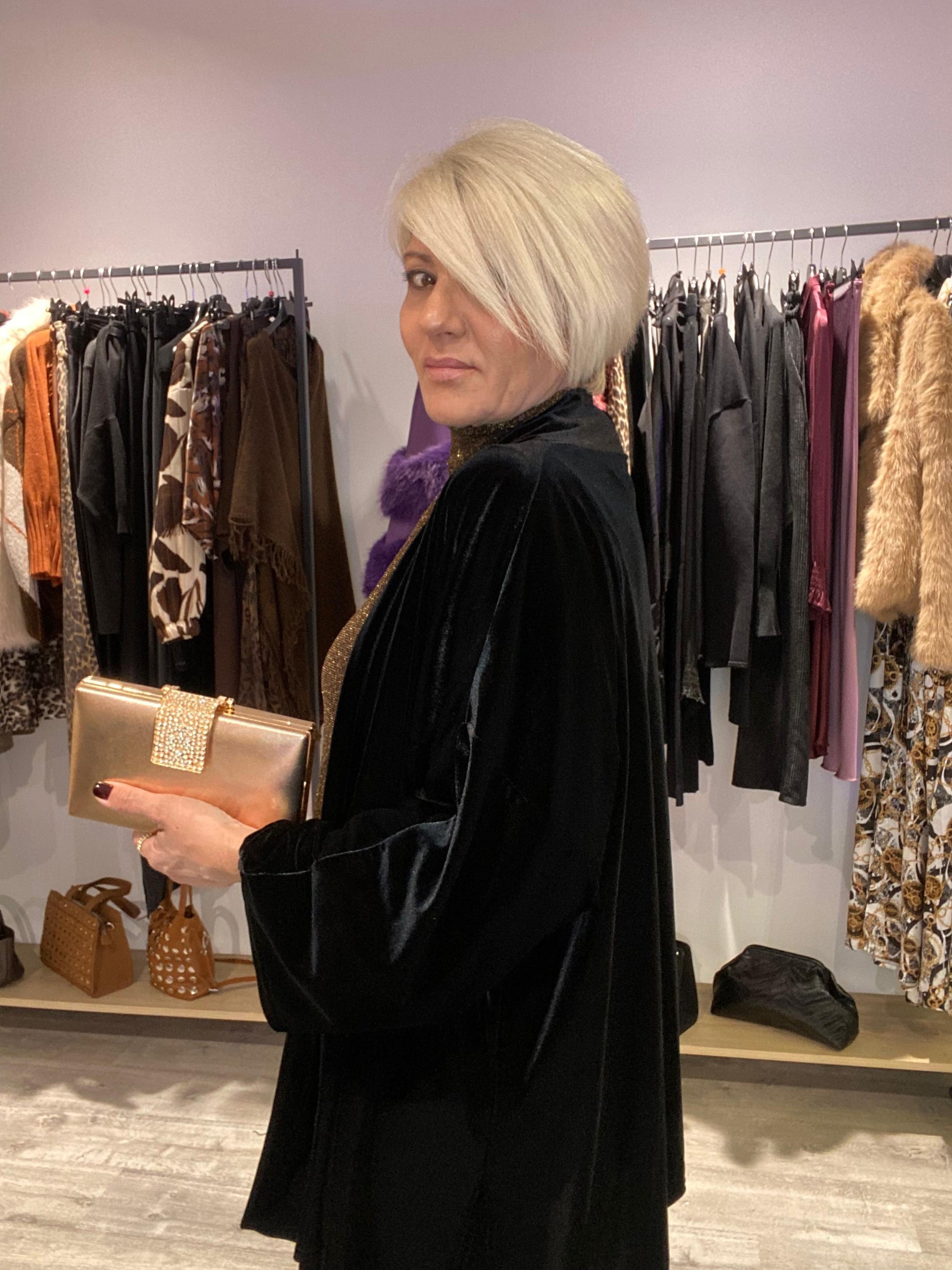 Elegancia fluida en terciopelo negro. Este kimono de terciopelo es la pieza perfecta para añadir sofisticación y movimiento a cualquier look. Diseño versátil que transforma tus conjuntos con un toque de elegancia boho-luxe.