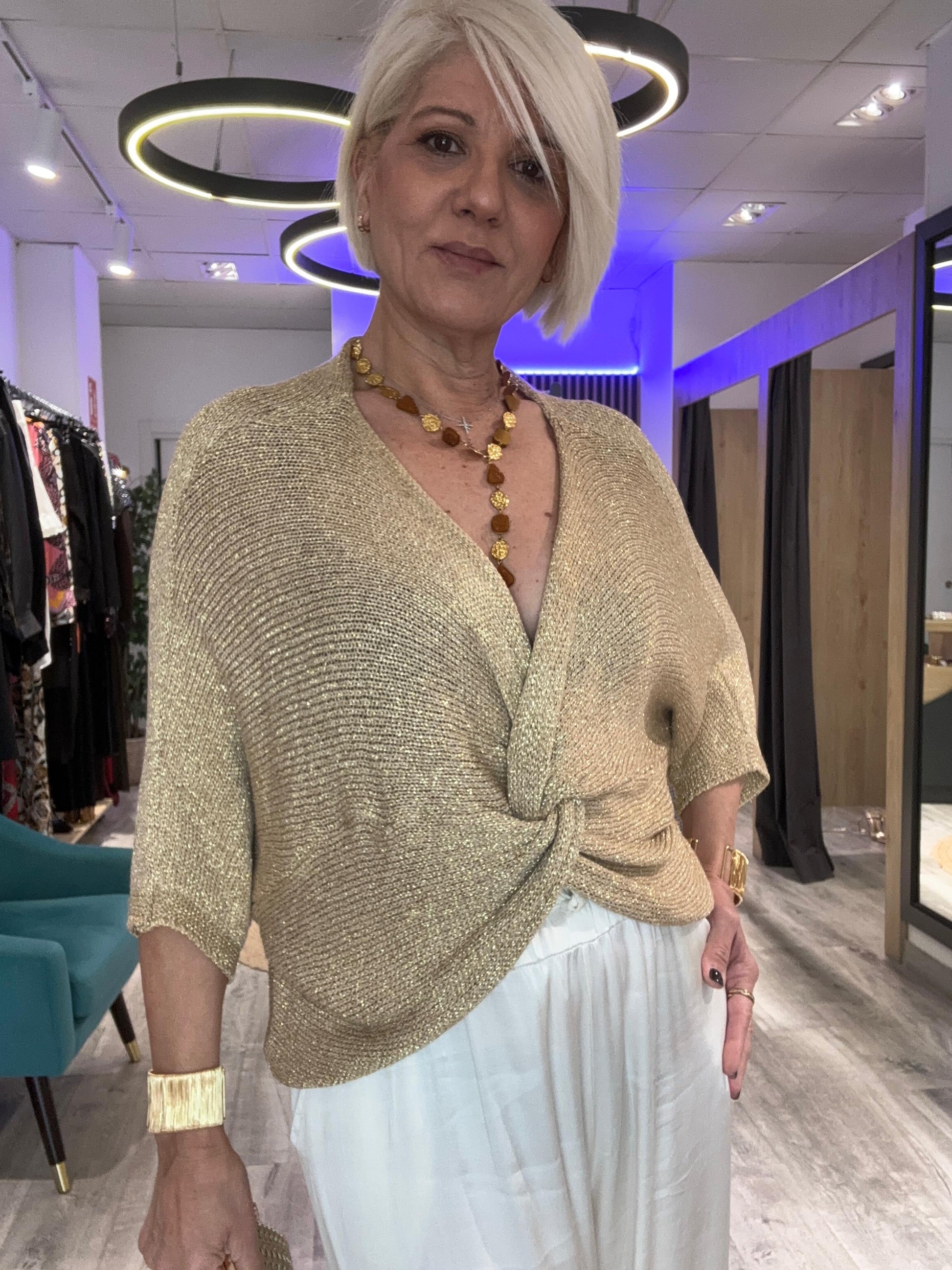 Descubre nuestro Jersey con Hilo Dorado y Nudo, una pieza sofisticada que combina elegancia y comodidad. El detalle de nudo frontal y los sutiles hilos dorados aportan un toque de lujo bohemio a tu armario.