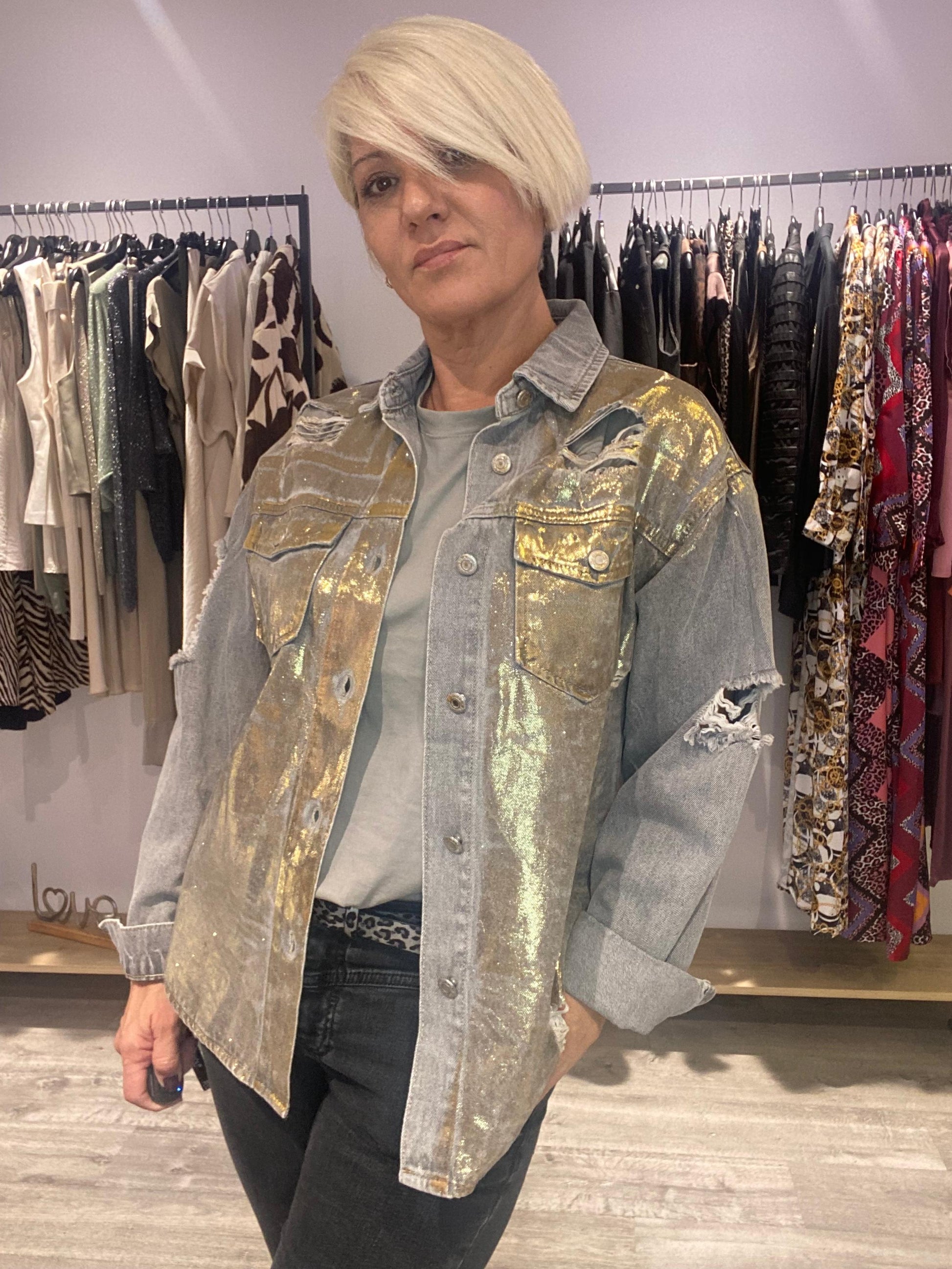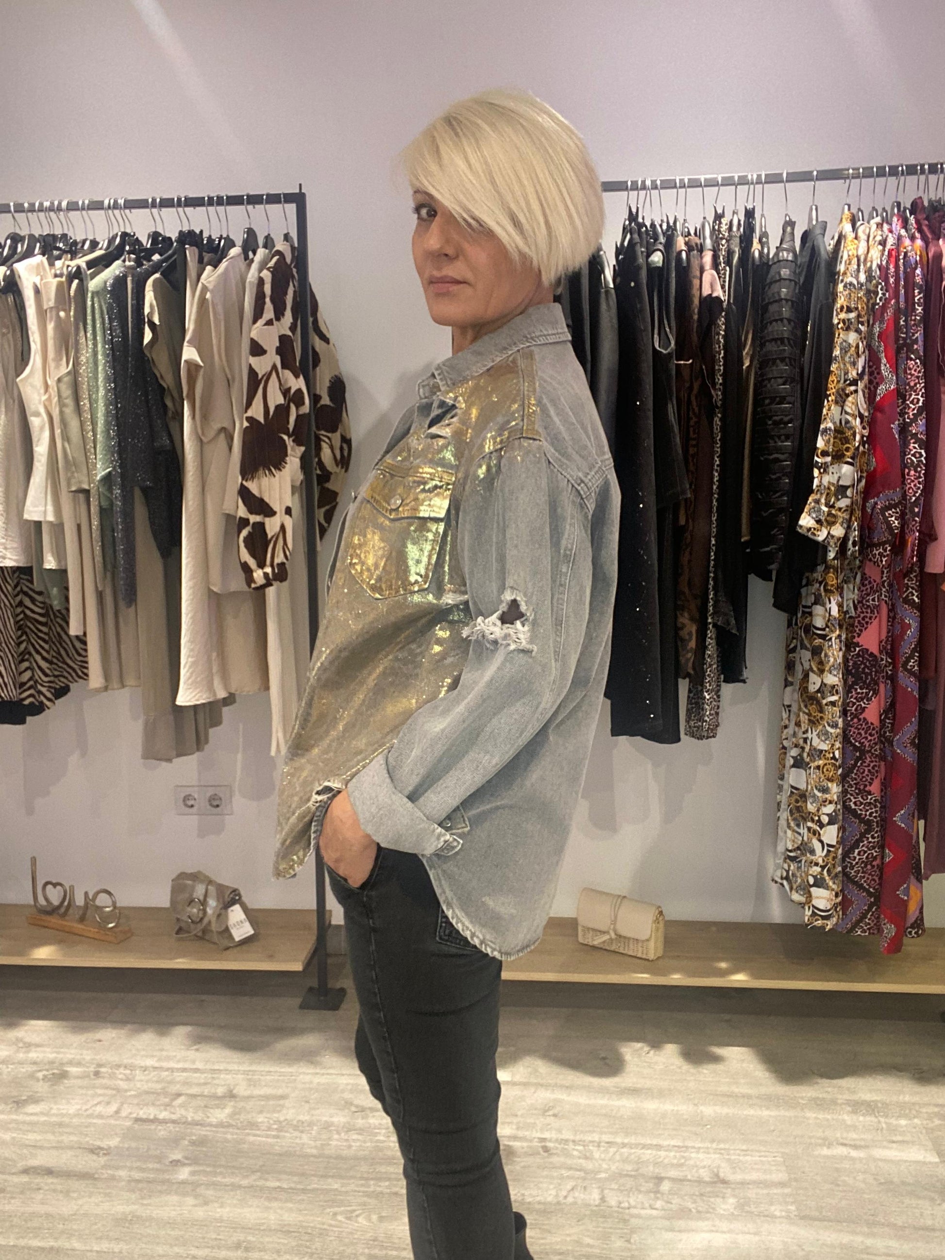 Sobre camisa tejido vaquero en color gris lavado a la piedra , con detalles laminados en color dorado en delantera
