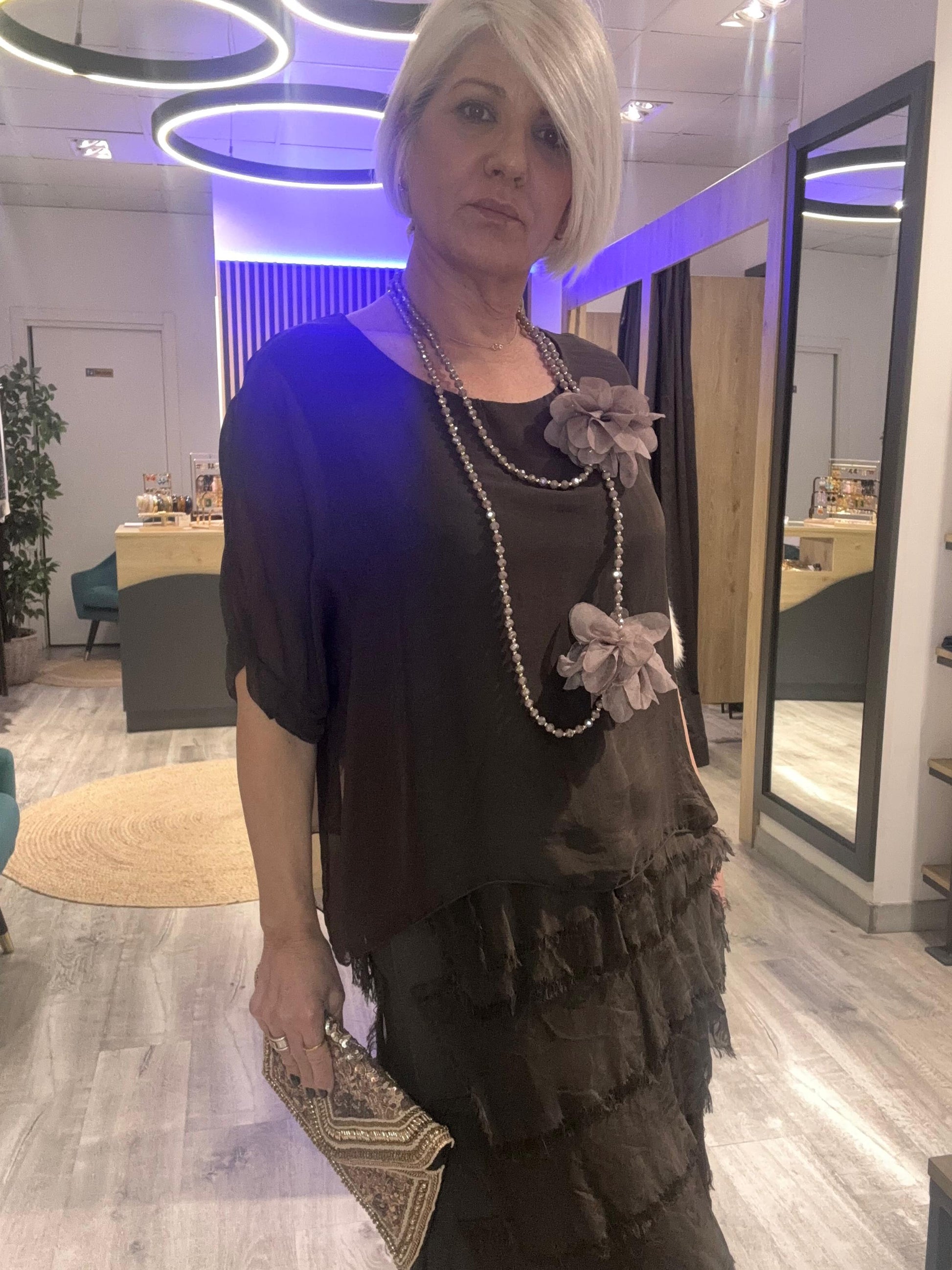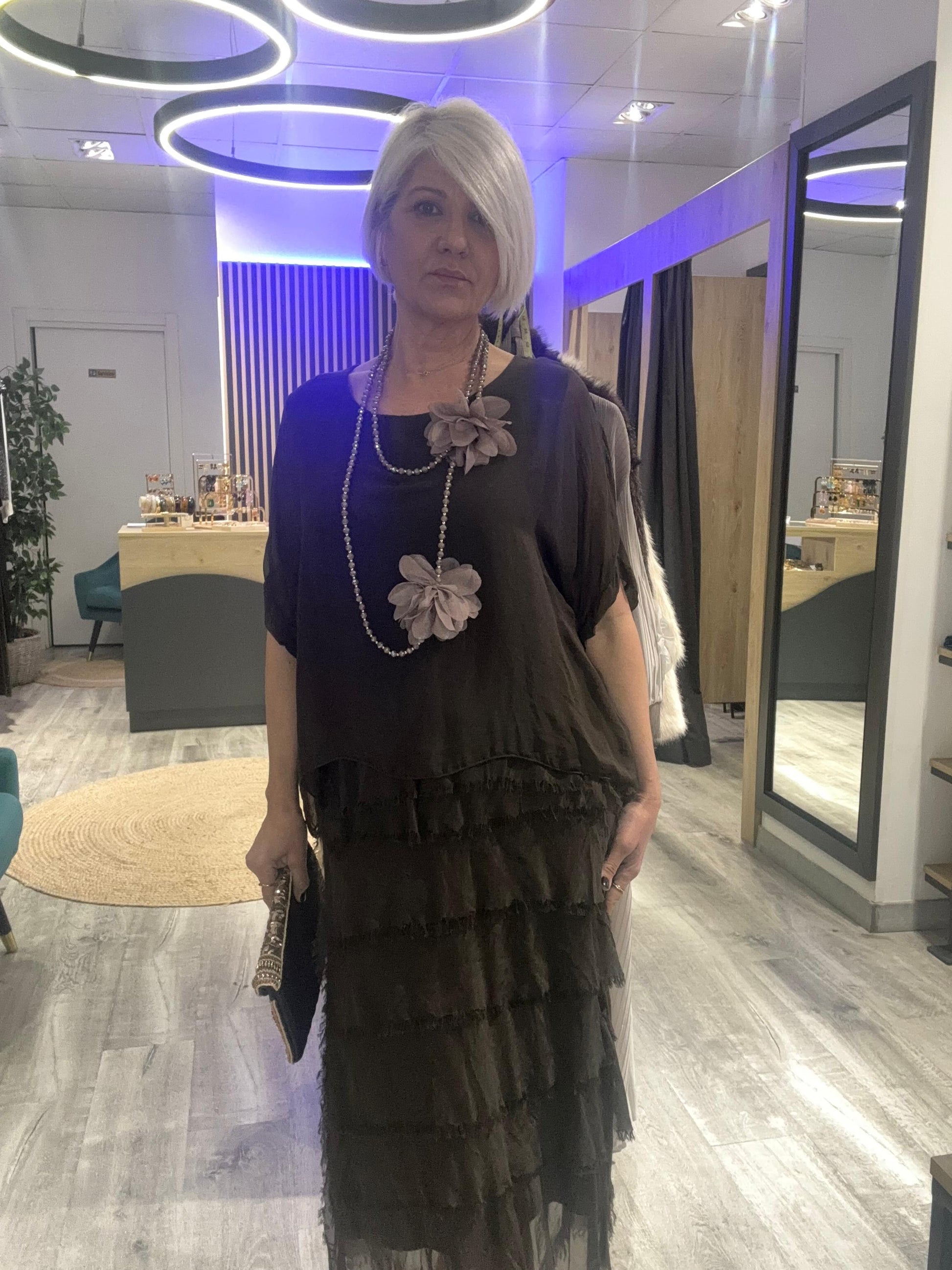 Vestido Adriana en elegante tono marrón chocolate con acabado sofisticado. Su tejido suave con mezcla de viscosa y seda ofrece comodidad y fluidez, perfecto para lucir elegante en cualquier ocasión especial.