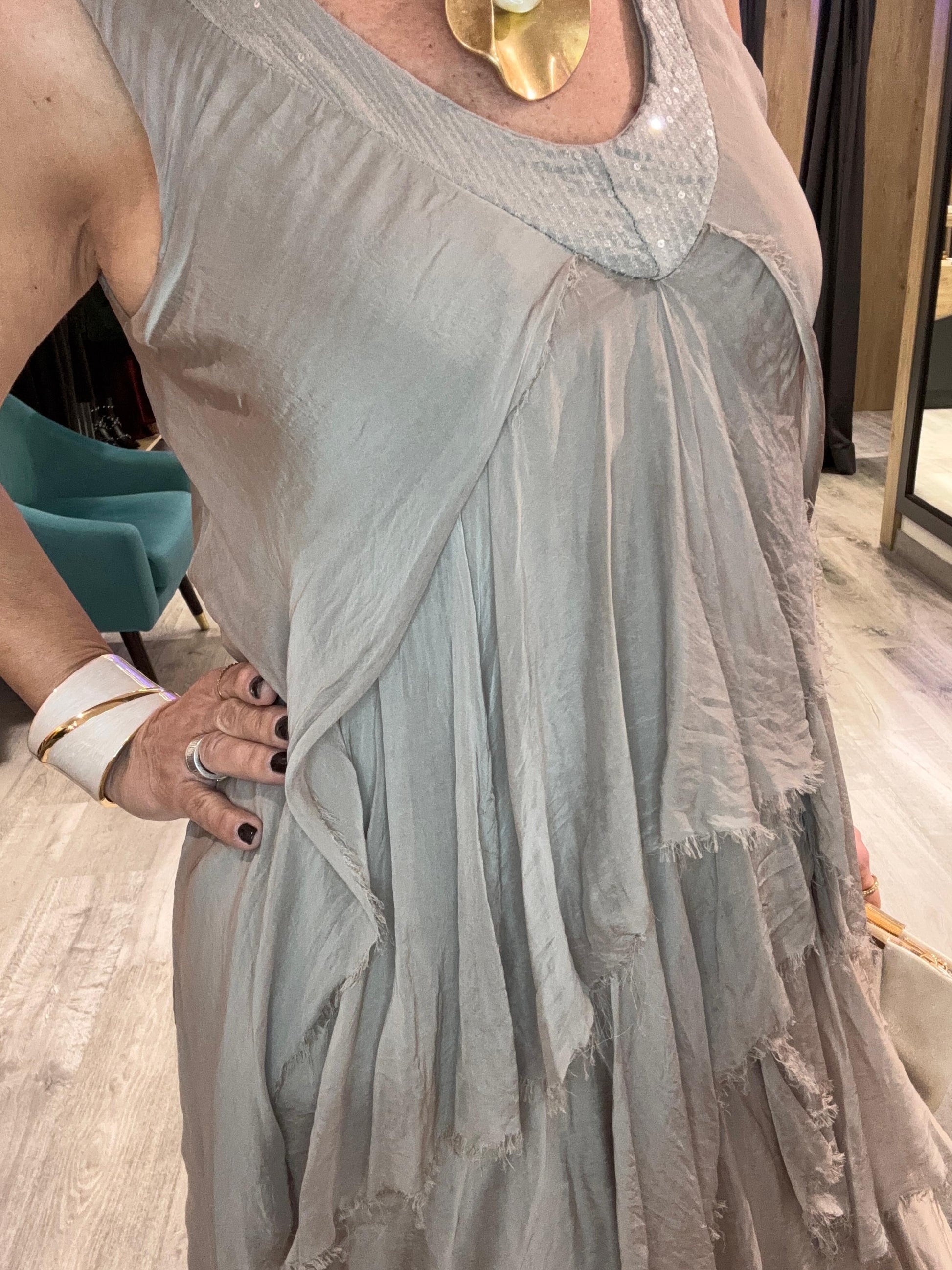 Un diseño romántico y sofisticado en seda natural que destaca por su elegancia atemporal. Este vestido largo con tirantes y escote en V incorpora delicados detalles de pallet en el escote, vuelos y una espectacular capa trasera que aporta movimiento y drama a cada paso. Perfecto para ocasiones especiales y eventos donde quieras destacar con estilo boho-chic.