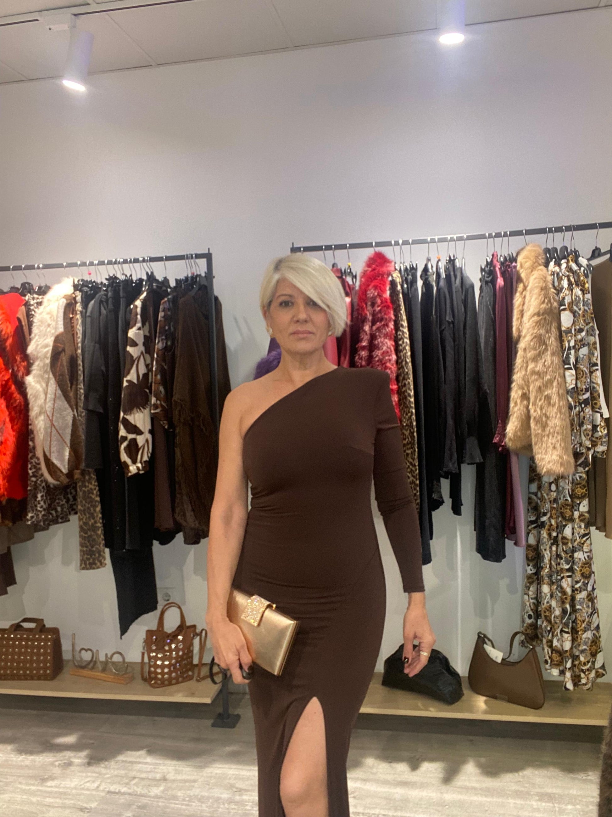 Vestido asimétrico en tono marrón cálido con diseño vanguardista y esencia boho-luxe.